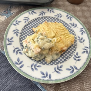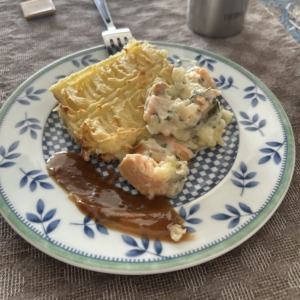 魚がたっぷり入ったホワイトソースとマッシュポテトが層になっていて