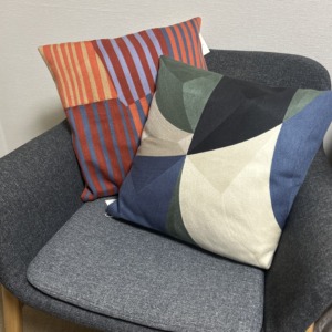 さて、色といえば前々から選びきれずに裸で置いてたクッションふたつ